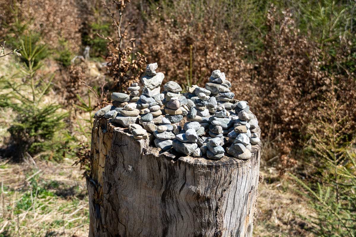 Unsere nächste Rast machen wir am Holzmühleweiher. Die Seen in dieser Landschaft verdanken wir den Gletschern der Eiszeit. Die ist zwar schon lange vorbei, auf die Wassertemperatur scheint das aber immer noch Einfluss zu haben. Zu einem Vollbad hat jedenfalls noch niemand Lust. Also wandern wir weiter in Richtung Langwuhrweiher.