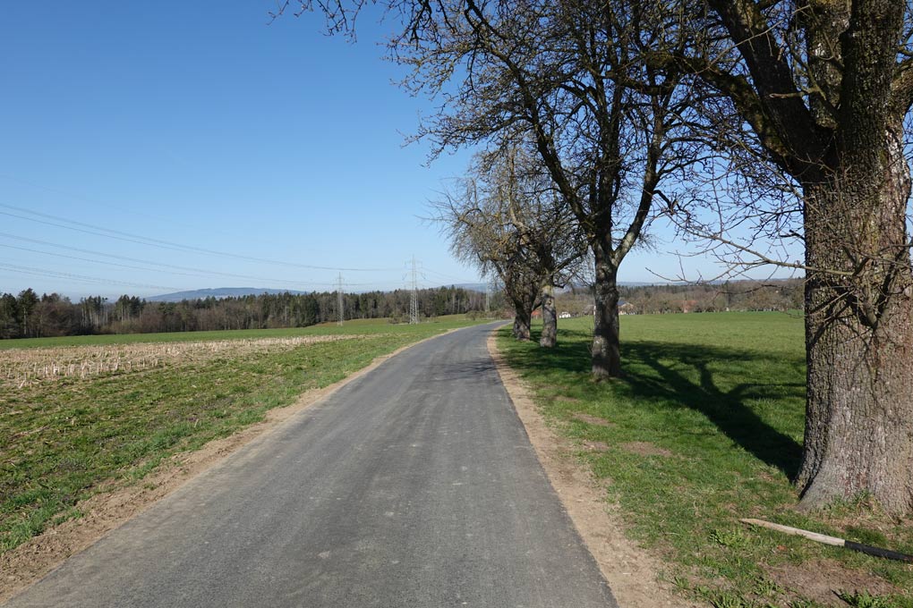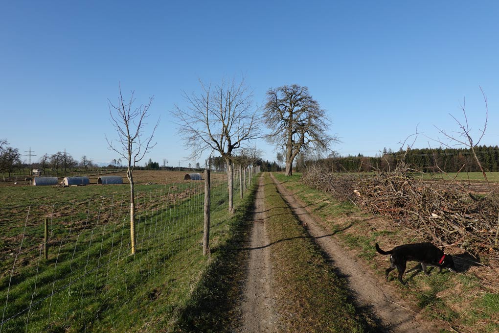 Wir überqueren wieder die Hauptstraße und folgen einer kleinen asphaltierten und mit Obstbäumen gesäumten Straße. Am Umspannwerk biegen wir rechts ab, überqueren zum zweiten Mal die Kemmelanger Straße. Entlang des Waldrandes, über die Wiesen und an vorbei an den Hopfenfeldern erreichen wir wieder unseren Ausgangspunkt.