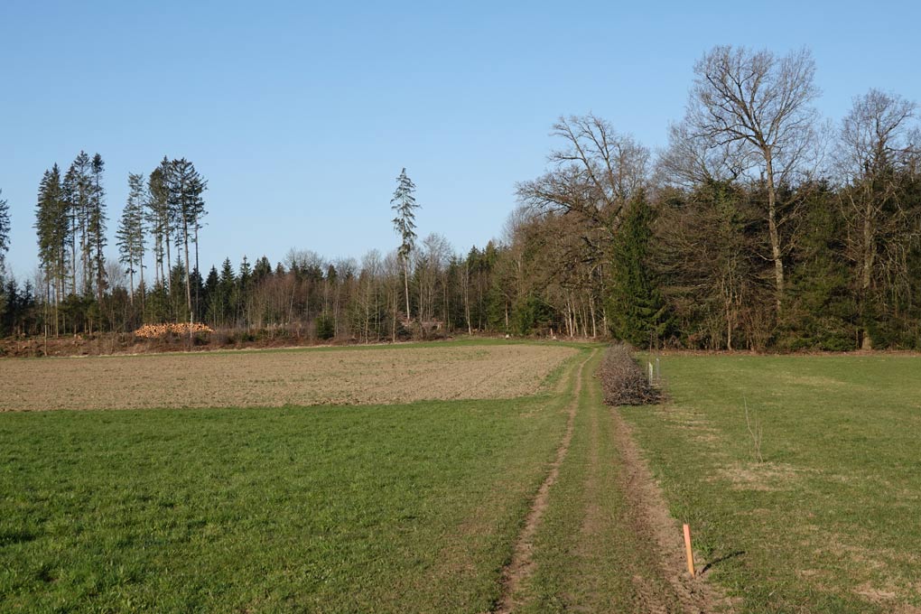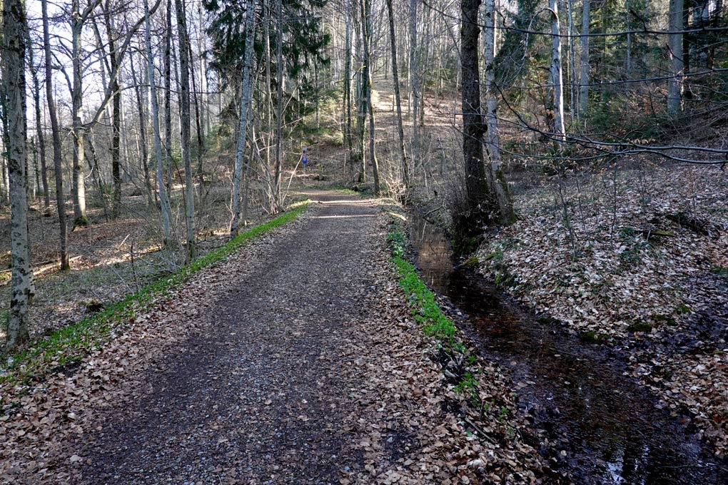 Der Feldweg führt in Richtung Wald. Hier biegen wir links ab und gehen geradeaus bis zur kleinen Waldstraße. Da biegen wir rechts ab. Ein kurzes Stück später biegen wir wiederum rechts auf einen Waldweg, der direkt an der riesigen Kiesgrube vorbei führt. Die Kiesgrube wird momentan aufgefüllt. Wir gehen weiter durch den Wald. Am Ende überqueren wir das erste Mal die Straße Fildenmoos.