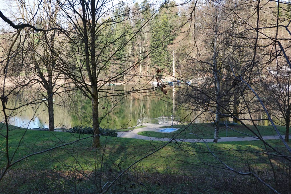Auf der anderen Straßenseite geht es rechts weiter durch den Wald bis wir die Kemmerlanger Straße erreichen. Hier gehen wir am Straßenrand ca 50 m nach rechts und biegen dann wieder nach links in einen Waldweg ab, der uns nun in Richtung Flappachweiher führt. Der Flappachweiher ist ein Freibad und für Hunde somit tabu. Auch Am Ende des Weihers gehen wir rechts und folgen einem steil ansteigenden Weg.
