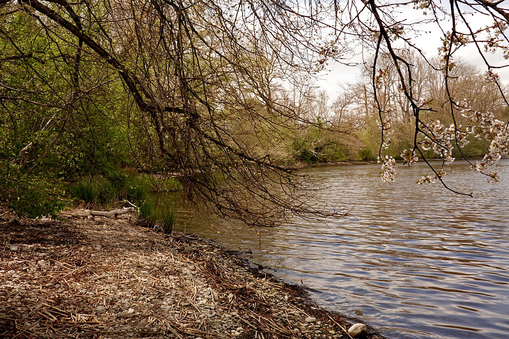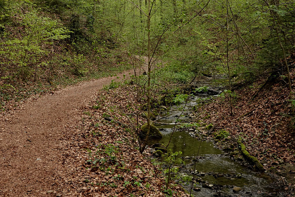 Am Südufer angekommen, halten wir uns links und folgen ein kleines Stück dem Stillen Bach. Am Anfang der großen Wiese biegt der Bach rechts ab. Wir gehen geradeaus und folgen dem Pfad über die Wiese. Oben an der Straße gehen wir einige Meter rechts und treffen dann links wieder auf den Stillen Bach. Der Kanal fließt hier hoch am Hang in Richtung Nessenreben. Dieser Wegabschnitt ist gerade jetzt im Frühjahr traumhaft schön.