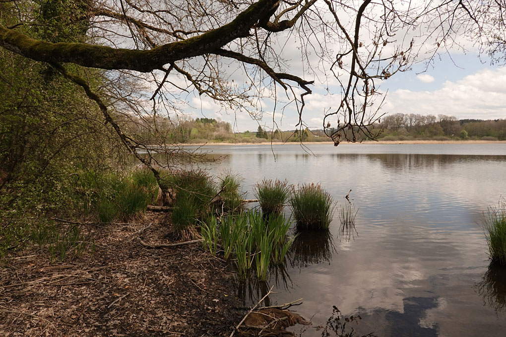 Auf einem schmalen Pfad folgen wir dem Westufer des Rösslerweihers. Am Anfang unserer Tour schafft sie Sonne es noch durch die Wolken. Ein großes Regengebiet nähert sich und wir hoffen, dass es noch ein wenig trocken bleibt. Das „wir“ muß ich aber gleich zurücknehmen. Khaya kann es kaum erwarten, das erste Bad im Rösslerweiher zu nehmen. Wasser begleitet uns auf der gesamten Tour. Deshalb ist dies unsere liebste Sommerwanderung. Das Westufer ist wunderschön und bietet eine Menge versteckter kleiner Buchten. Eigentlich eine Badeparadies, wären da nicht die vielen Mücken im Sommer. Nun, weder Baden noch Mücken sind Anfang Mai ein Thema.