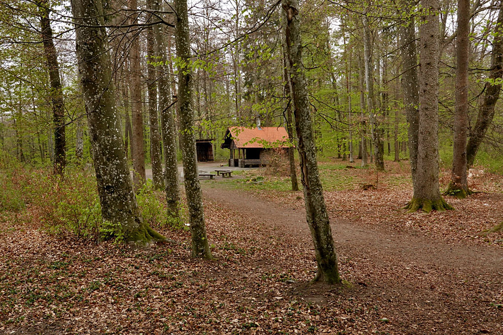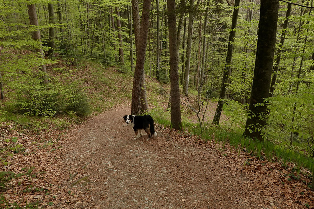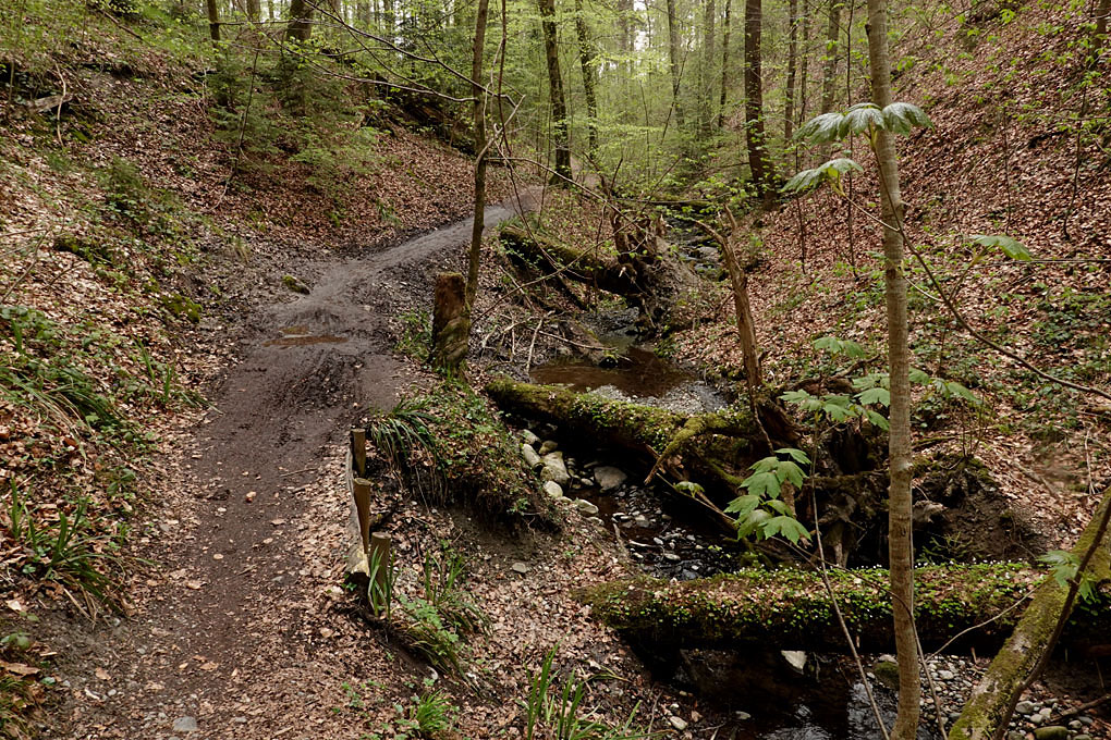 Die Wolken werden nun immer dunkler und wir machen uns auf den Rückweg. Khaya ist schon nass und auch ich werde es nicht trocken bis zum Auto schaffen. Wir gehen in Richtung Grill- und Spielplatz und nehmen den Weg, der links nach unten führt in Richtung Tobelbach. Hier geht es steil nach unten und wir folgen dann dem Tobelbach.