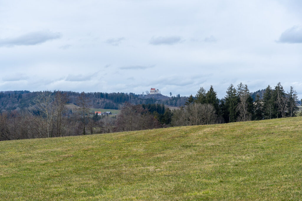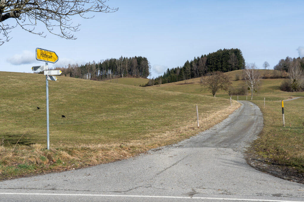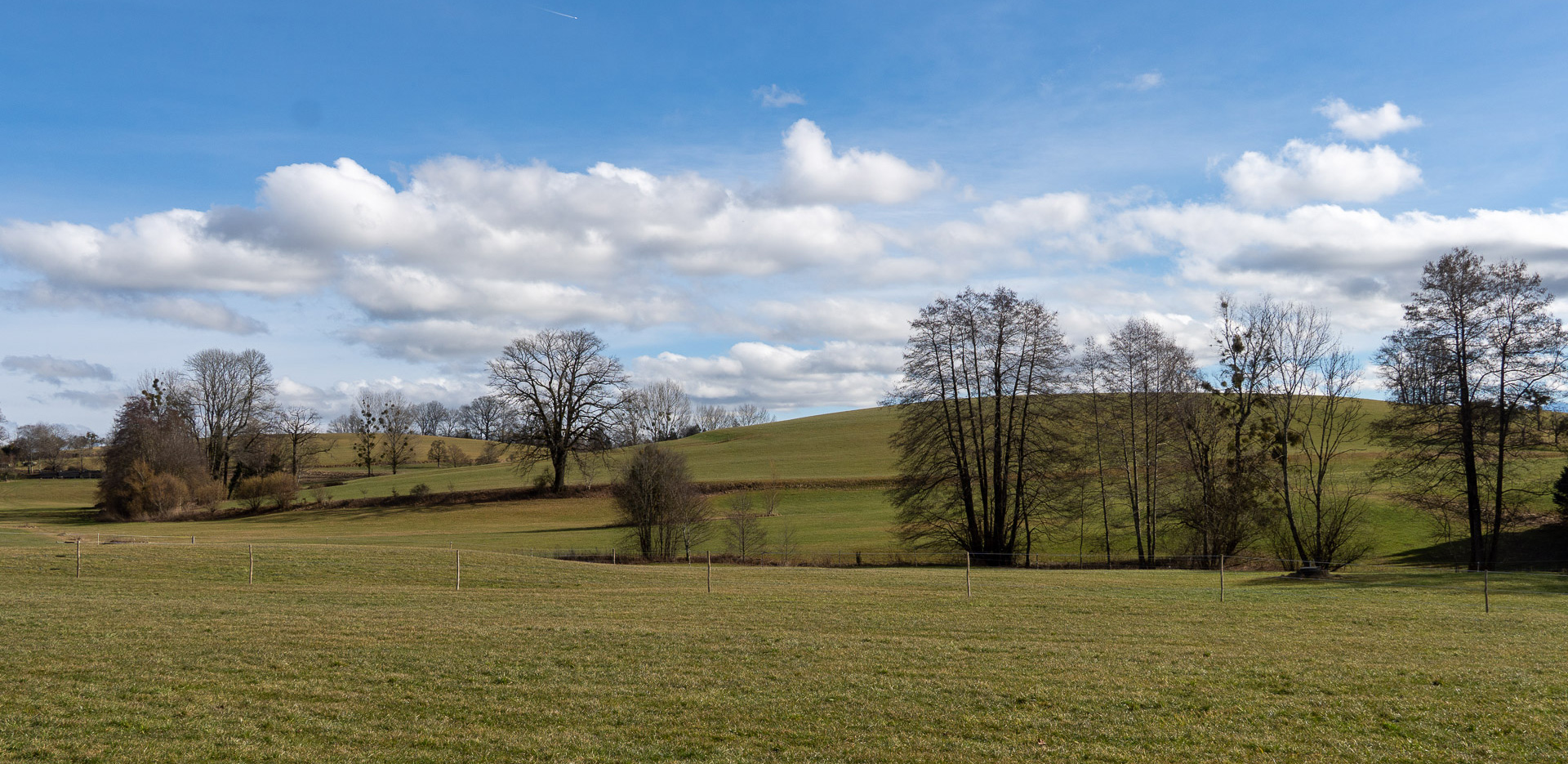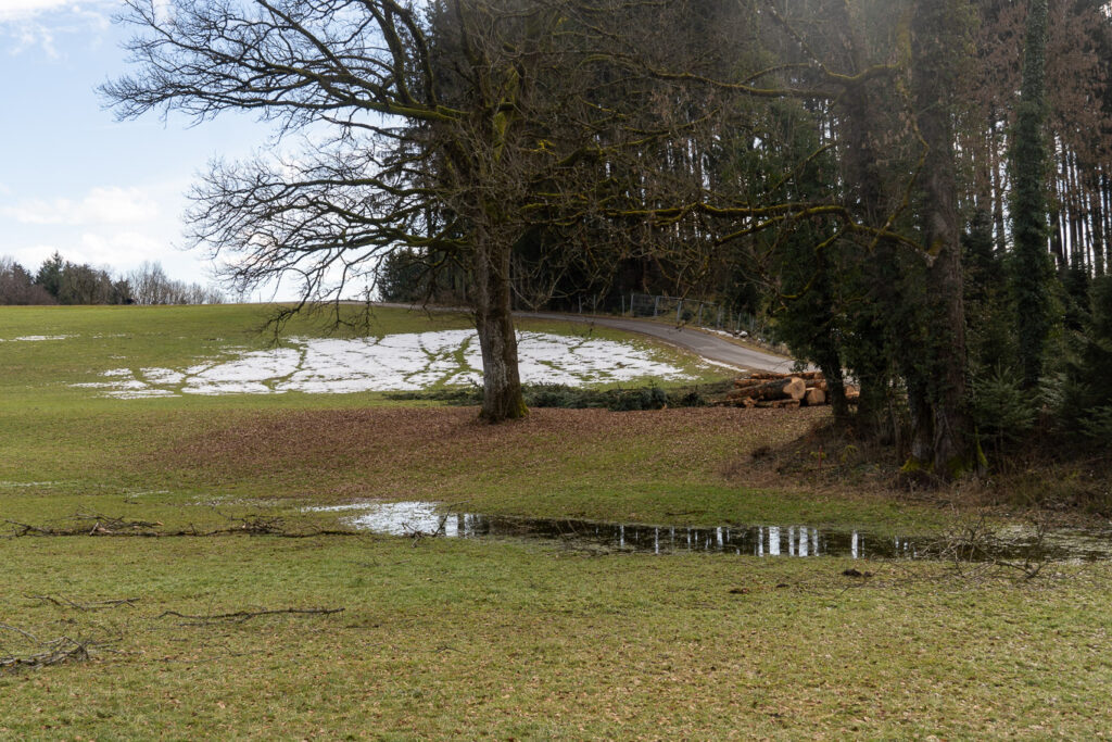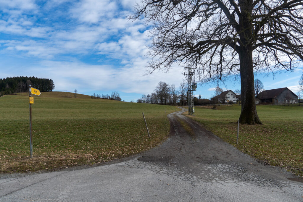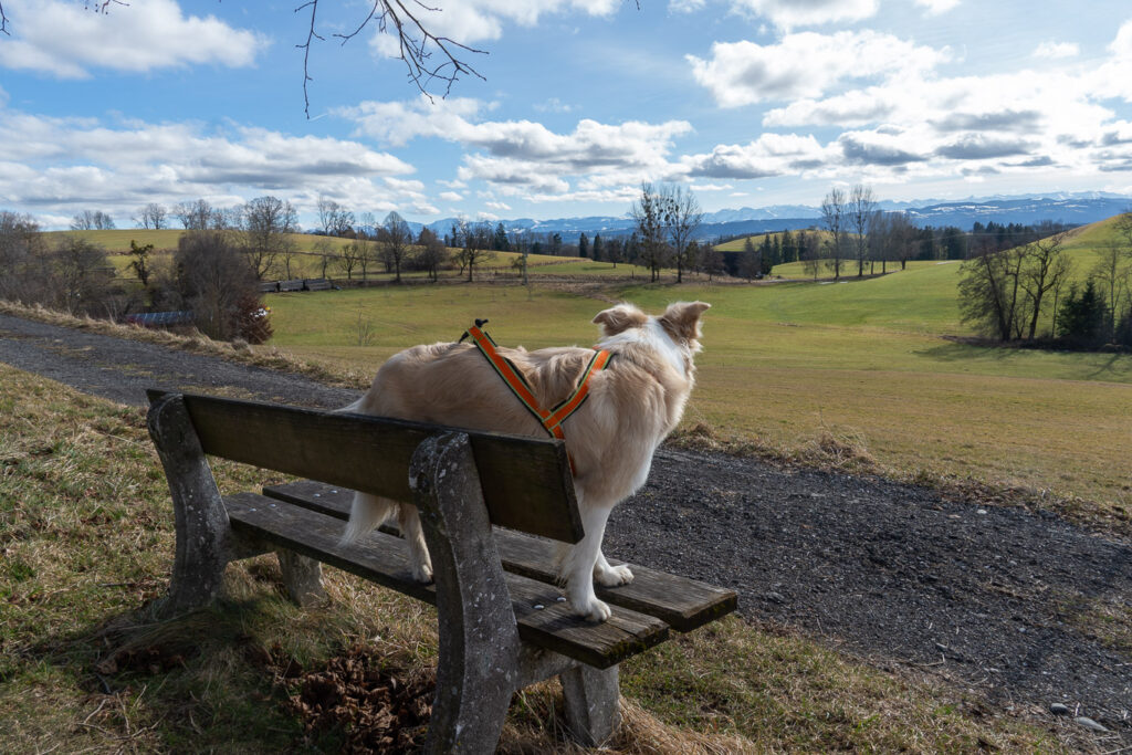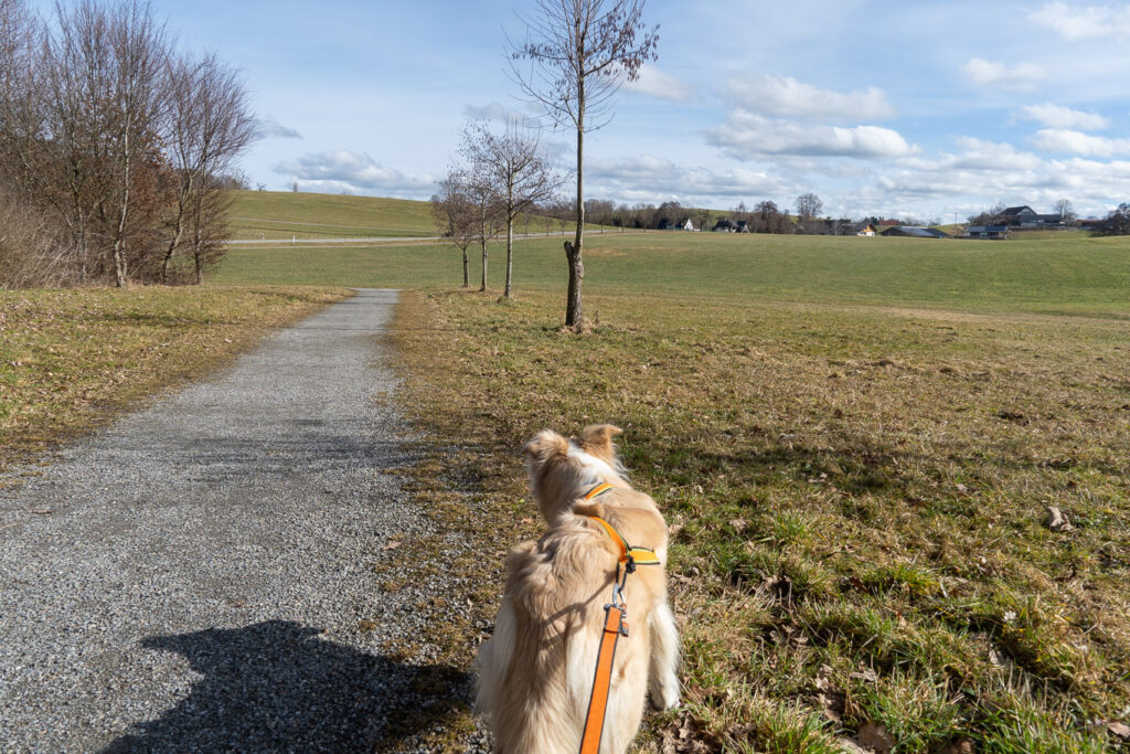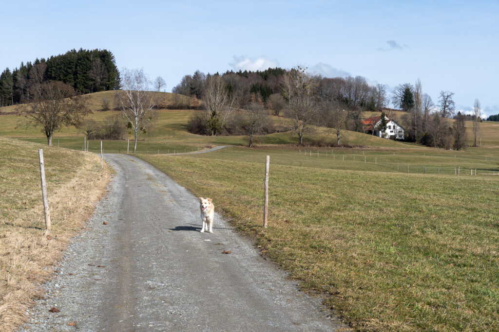 Heute ist der große Faschingsumzug in Amtzell und es sind jede Menge Narren unterwegs. Die Sonne scheint, der Schnee ist weg und der Regen hat die Straßen vom Salz befreit. Also eine gute Gelegenheit, die Wandersaison einzuläuten. Wir entfernen uns von dem närrischen Treiben und machen heute unsere Rundwanderung nach Niemandsfreund. Mit dem neuen Zuggeschirr und der Bungeeleine müssen wir noch etwas üben. Aber es klappt schon ganz gut.