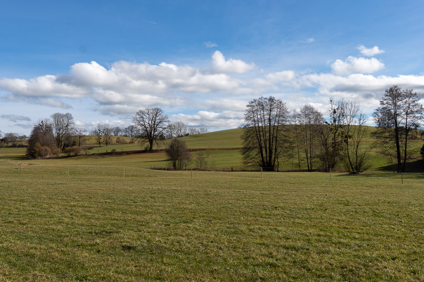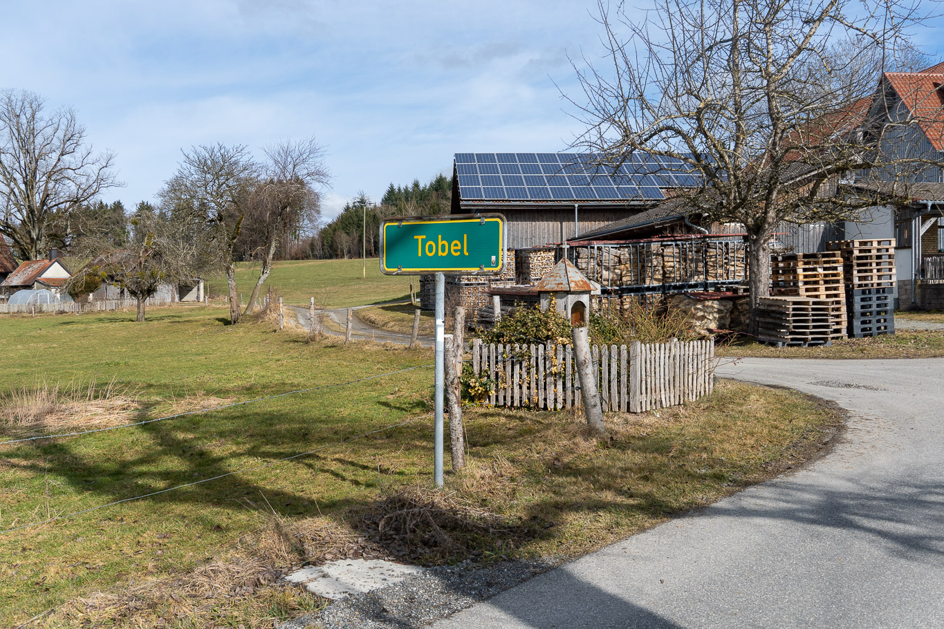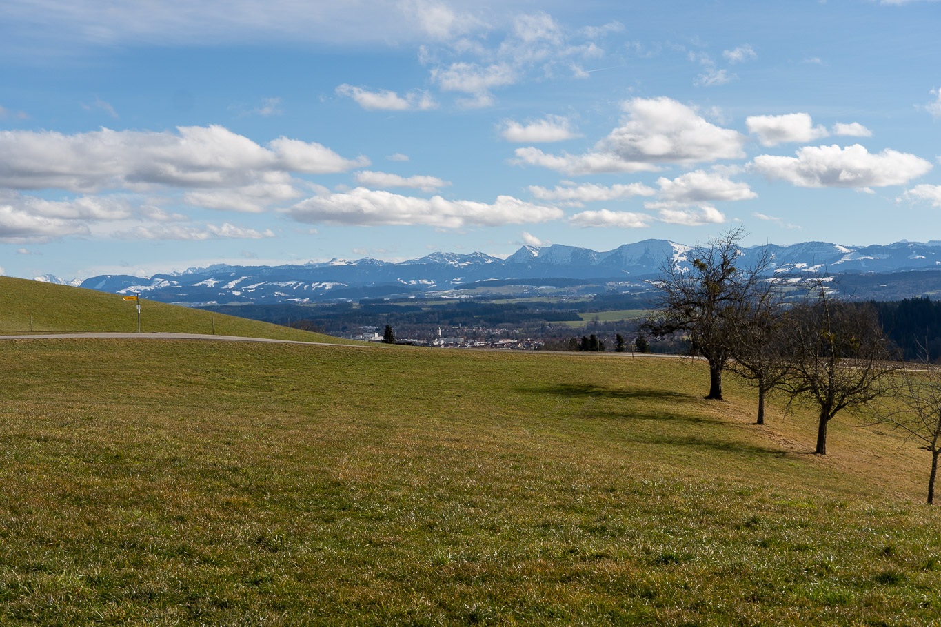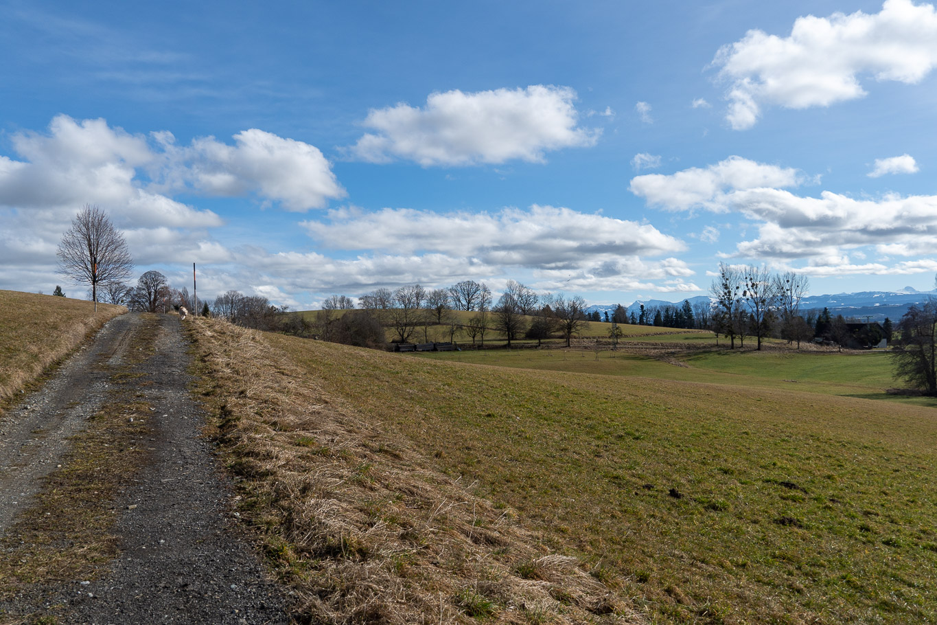 Heute ist der große Faschingsumzug in Amtzell und es sind jede Menge Narren unterwegs. Die Sonne scheint, der Schnee ist weg und der Regen hat die Straßen vom Salz befreit. Also eine gute Gelegenheit, die Wandersaison einzuläuten. Wir entfernen uns von dem närrischen Treiben und machen heute unsere Rundwanderung nach Niemandsfreund. Mit dem neuen Zuggeschirr und der Bungeeleine müssen wir noch etwas üben. Aber es klappt schon ganz gut.